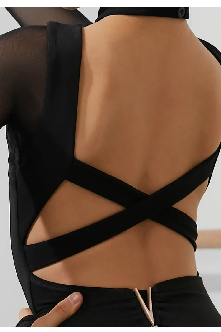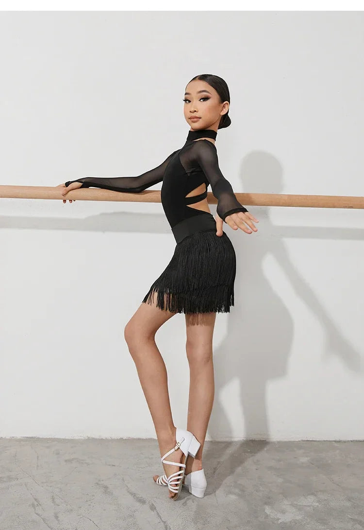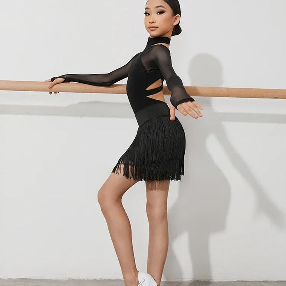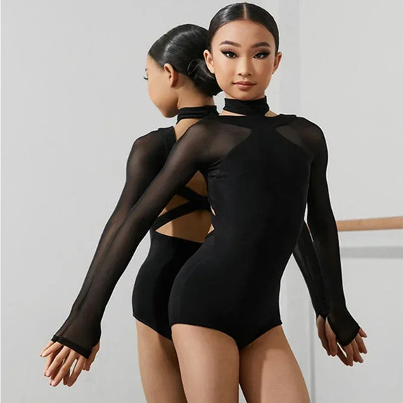 Black Latin Dance Clothing Jumpsuit Girls Long Sleeves Leotard Latin Tops Ballroom Dance Performance Wear Cha Cha Bodysuit Child